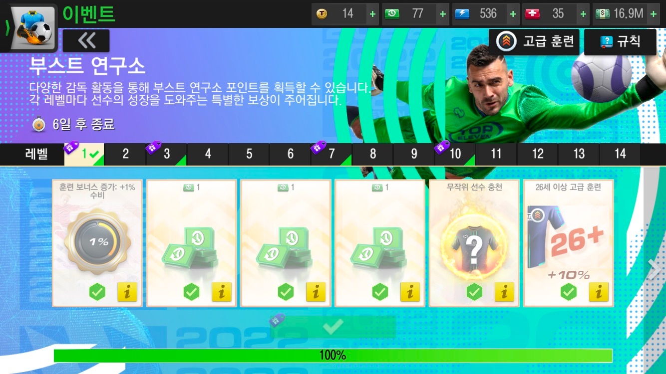 보상 : 훈련보너스증가, 무작위 선수 사기 충전, 고급훈련, [휴식, 사기부스터, 치료, 스킬부스트].