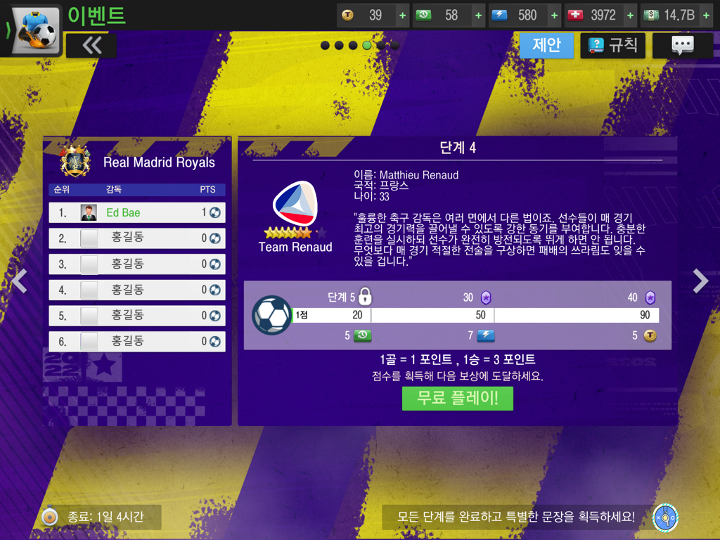 받을 수 있는 보상은 기회를 잘 찾아서 가능한 보상을 많이 받고 현금은 효율적으로 사용해서 게임을 즐기시면 더욱 재미있을 것이라고 생각합니다. 트리플 크라운(챔스 우승, 리그 우승, 컵 우승) 한 번 이상 달성해 봐야 하지 않겠어요.