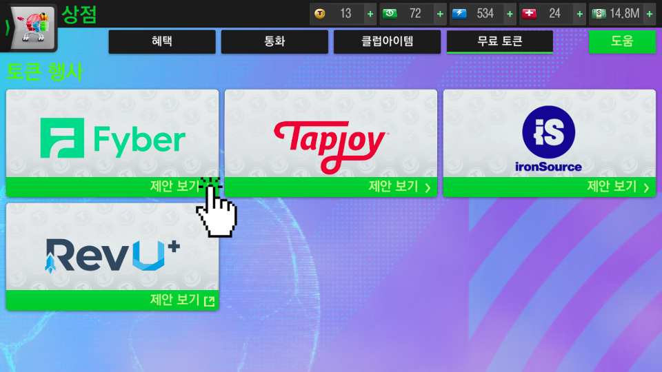 "무료 토큰" 페이지입니다. 예를 들면, "Fyber 제안보기"를 클릭합니다.