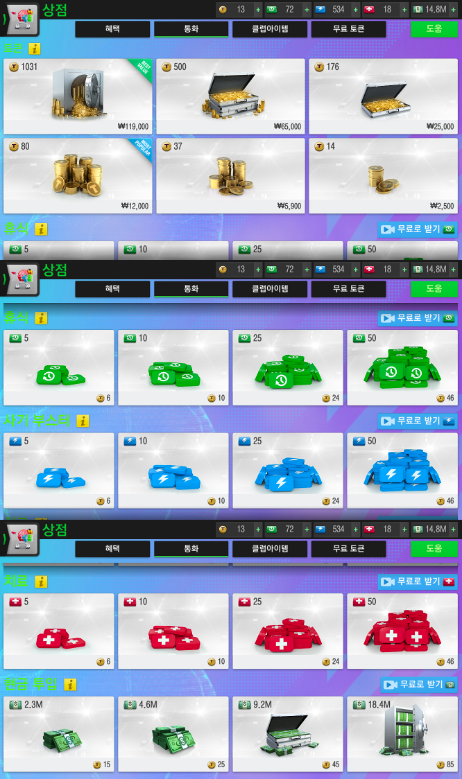상점의 통화 페이지로 이동을 하면 토큰, 휴식, 사기부스터, 치료, 현금투입 메뉴가 있습니다. 여기에서 휴식, 사기부스터, 치료, 현금투입 상품은 "무료로 받기"가 가능합니다.