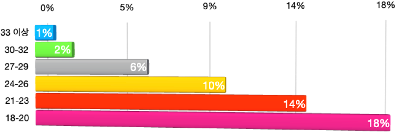 그림에서 보면 가장 어린 선수 20세 이하가 16%~20%로 가장 높게 나오고 있습니다.