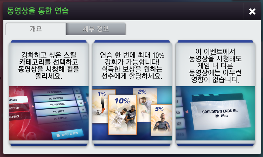 사실, 일일 훈련 광고보기를 소진한 경우에는 쿨다운시간이 끝나도 "동영상을 통한 연습"을 하려고 해도 "시청해서 돌리기" 버튼이 비활성 상태가 되어서 이벤트를 진행할 수가 없더라구요.