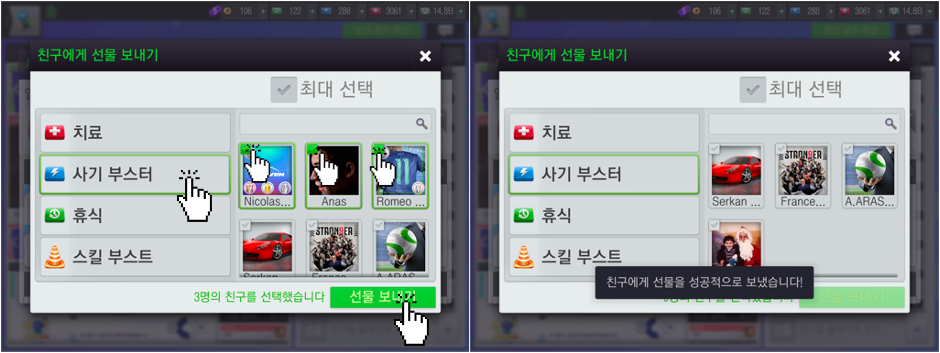 저는 '치료' -> '사기부스터' -> '스킬부스트' -> '휴식' 순으로 친구를 선택하는데, '휴식' 선물 수가 너무 많기 때문에 가장 마지막에 선택해 주고 있습니다.