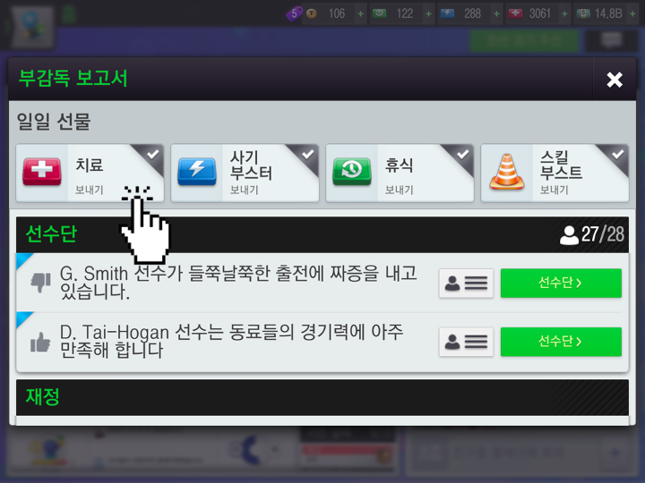 경기의 승리를 위하여 '치료', '사기부스터', '휴식', '스킬부스트'를 잘 관리하는데 도움이 되시기를 바랍니다.