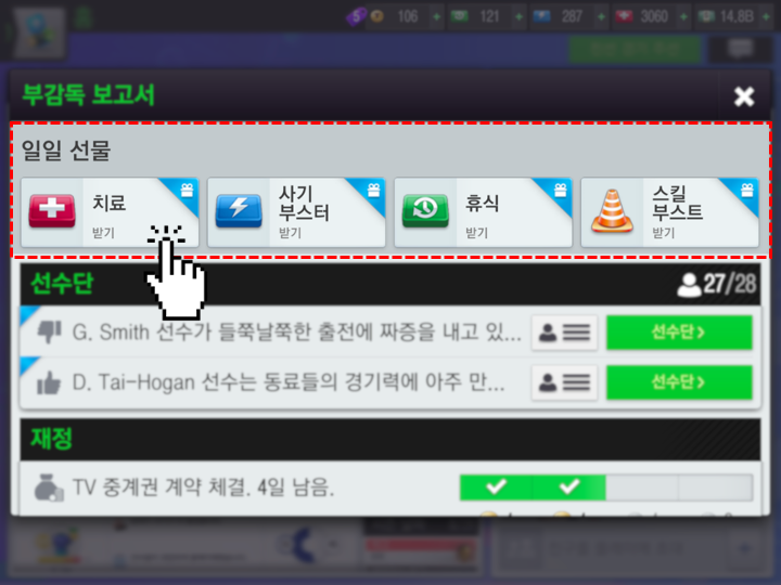'일일선물'은 선수들을 관리하기 위해서 필요한 4가지 선물이 있습니다.