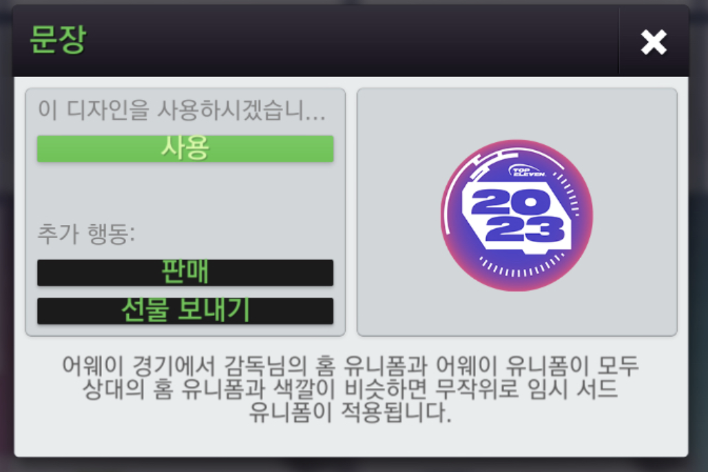 이번 선물은 클럽 엠블럼입니다. 탑일레븐 2023 1백만 서포트 도전 달성을 기념하기 위한 것으로 모두에게 스페셜 리워드로 주고 있습니다.
