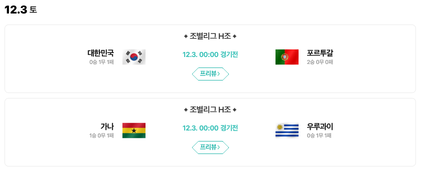 대한민국은 오는 12월 3일 오전 0시(한국시간)부터 포르투갈과 H조 최종전을 펼치게 됩니다.