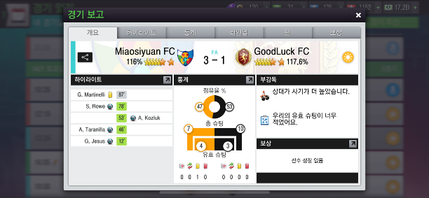 상대의 사기가 높았다고 합니다. 제가 훈련한 팀과 선수 사기는 '8' 이었습니다.